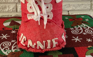 Christmas boots are a tradition in my family. It all started with my grandma Sophie. She loved to create and handcrafted boots for each us one Christmas many years ago. I would excitedly check to see what toys and treats Santa left inside. (Thanks Mom!) As our family grew and my siblings had children of their own, I continued the tradition.